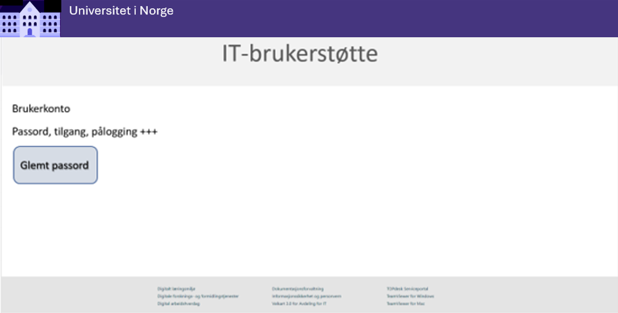 Hvis brukere glemmer passordet sitt, kan de via lenke ledes til alternativet "Glemt passord" i Account Claim. Brukeren må først autentisere seg enten via ID-porten eller tofaktorautentisering for så kunne sette et nytt passord i samsvar med passordpolicyen. Det er institusjonen som avgjør hvor funksjonen “Glemt passord” skal tilgjengeliggjøres.