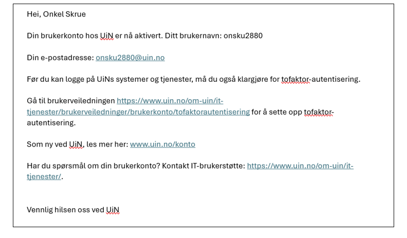 Når en person registreres i SAP, UBW, GREG eller FS ved en virksomhet opprettes det automatisk en brukerkonto i Rapid Identity. Basert på konfigurerbart antall dager i forkant av startdato, sendes en e-post fra Rapid Identity til brukeren sin privat e-postadresse, med informasjon og vedlagt lenke.