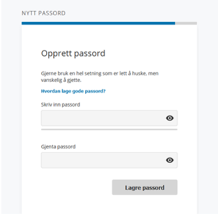 - Nå kan du opprette et passord, skriv inn ønsket passord og gjenta ønsket passord. Deretter klikk på "lagre passord". Det er krav til hvordan et passord skal se ut. Hvis du er usikker, kan du klikke på "Hvordan lage gode passord" for å se hvilke retningslinjer som gjelder.