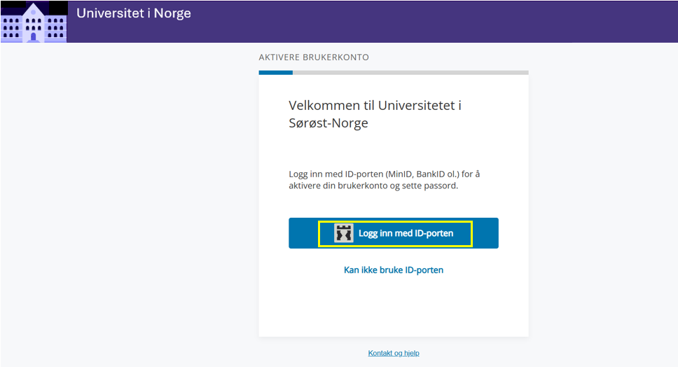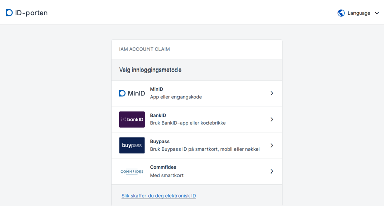 Dersom brukeren har norsk e-ID, vil lenken som oppgis føre brukeren til kontoaktivering (Account Claim) hvor han/hun kan velge den autentiseringsmetoden i ID-porten de ønsker.